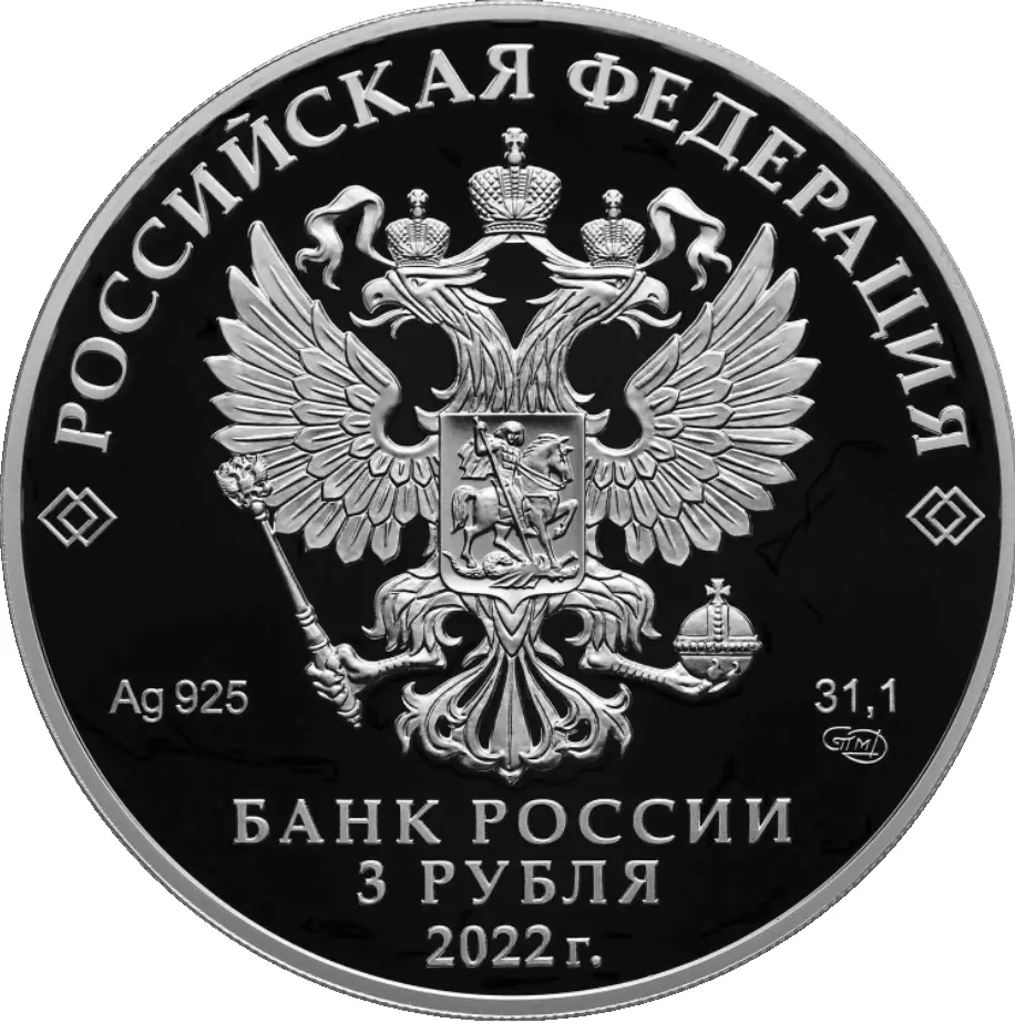 рельефное изображение Государственного герба Российской Федерации, над ним вдоль канта — надпись полукругом: «РОССИЙСКАЯ ФЕДЕРАЦИЯ», обрамленная с обеих сторон сдвоенными ромбами, под гербом: слева — обозначения драгоценного металла и пробы сплава, справа — содержание химически чистого металла и товарный знак монетного двора, внизу в центре в три строки — надпись: «БАНК РОССИИ», номинал монеты: «3 РУБЛЯ», год выпуска: «2022 г.».