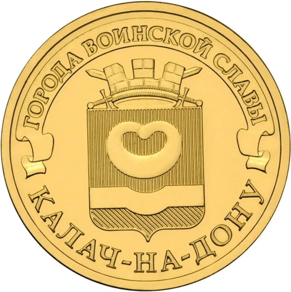 герб города Калач-на-Дону, над ним, на ленте – надпись полукругом: "ГОРОДА ВОИНСКОЙ СЛАВЫ", внизу вдоль канта – надпись: "КАЛАЧ-НА-ДОНУ".