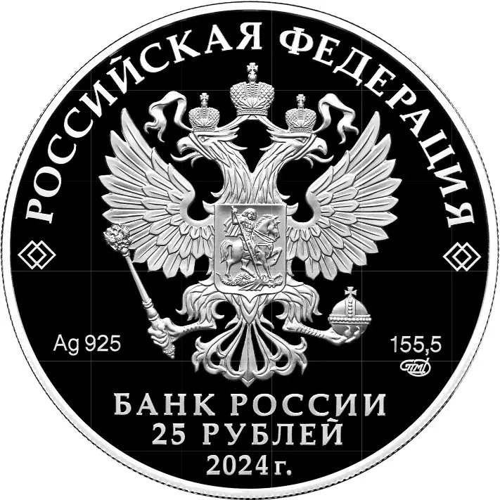 рельефное изображение Государственного герба Российской Федерации, над ним вдоль канта – надпись полукругом «РОССИЙСКАЯ ФЕДЕРАЦИЯ», обрамленная с обеих сторон сдвоенными ромбами, под гербом слева – обозначения драгоценного металла и пробы сплава, справа – содержание химически чистого металла и товарный знак монетного двора, внизу в центре в три строки – надпись «БАНК РОССИИ», номинал монеты «25 РУБЛЕЙ», год выпуска «2024 г.».