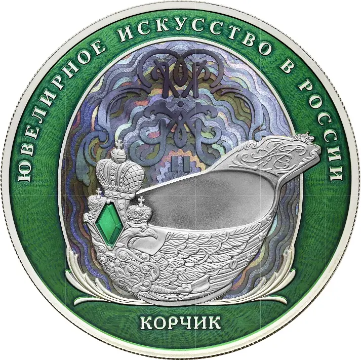 рельефное изображение изделия фирмы «Фаберже» – серебряного корчика; фон с вензелем Николая II, напоминающий формой яйцо, выполнен с эффектом интерференции света и обрамлен овальной рельефной рамкой с декоративным орнаментом; внешняя часть фона, а также изображение изумруда на корчике выполнены с применением цветной эмали; имеются надписи: вверху по окружности – «ЮВЕЛИРНОЕ ИСКУССТВО В РОССИИ», внизу – «КОРЧИК».