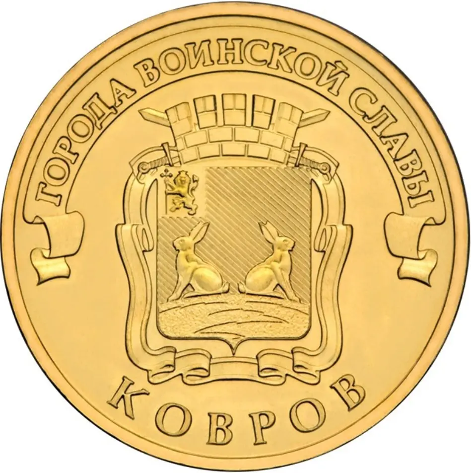 герб города Коврова, над ним, на ленте – надпись полукругом: "ГОРОДА ВОИНСКОЙ СЛАВЫ", внизу вдоль канта – надпись: "КОВРОВ".