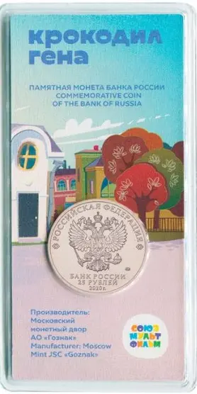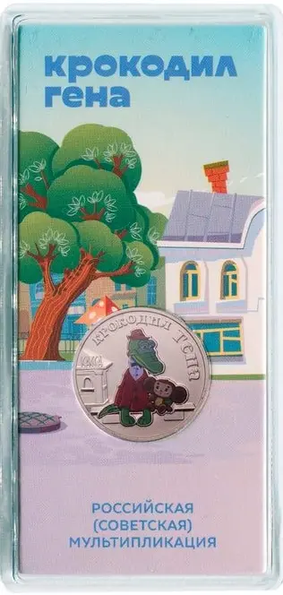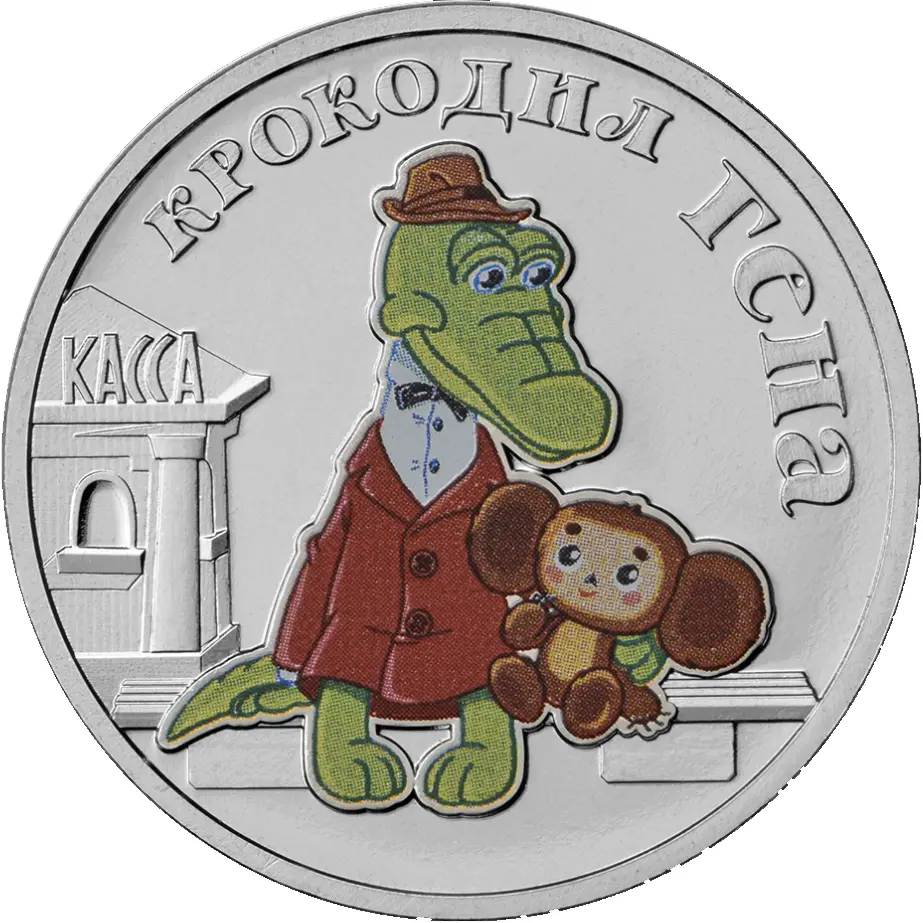 выполненное в цвете изображение героев мультфильма «Крокодил Гена», слева — рельефное изображение железнодорожной кассы; справа вверху вдоль канта — надпись: «КРОКОДИЛ ГЕНА».