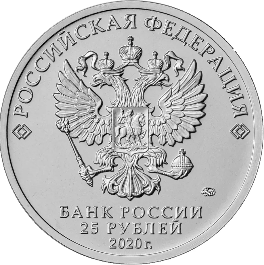 в центре — рельефное изображение Государственного герба Российской Федерации, над ним вдоль канта — надпись полукругом: «РОССИЙСКАЯ ФЕДЕРАЦИЯ», обрамленная с обеих сторон сдвоенными ромбами, под гербом в центре в три строки — надпись: «БАНК РОССИИ», номинал монеты: «25 РУБЛЕЙ», год выпуска: «2020 г.», справа — товарный знак монетного двора.