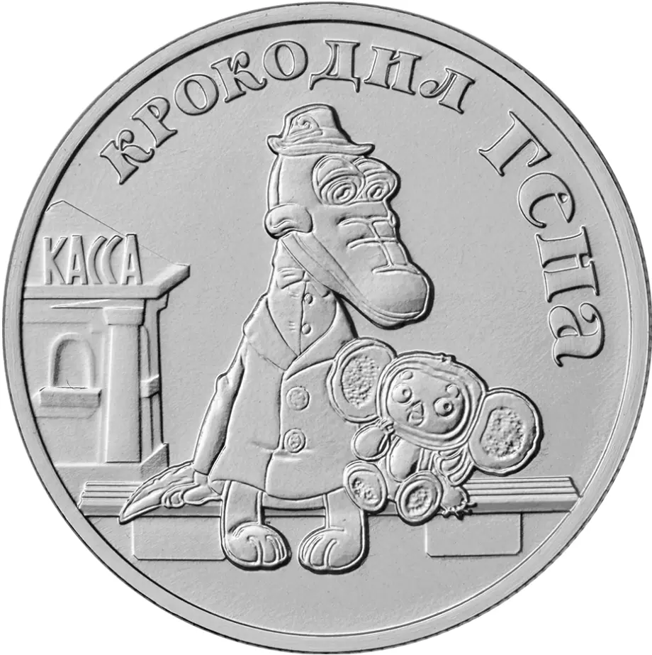 в центре — рельефное изображение героев мультфильма «Крокодил Гена», слева — железнодорожной кассы; справа вверху вдоль канта — надпись: «КРОКОДИЛ ГЕНА».
