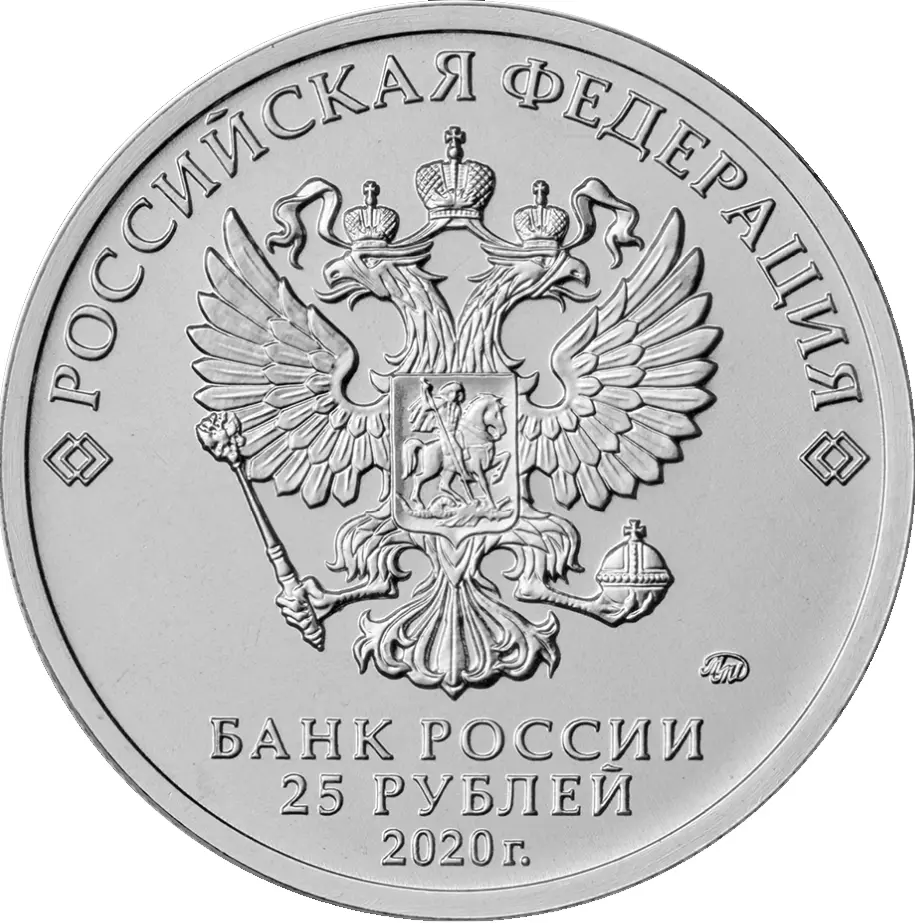 в центре — рельефное изображение Государственного герба Российской Федерации, над ним вдоль канта — надпись полукругом: «РОССИЙСКАЯ ФЕДЕРАЦИЯ», обрамленная с обеих сторон сдвоенными ромбами, под гербом в центре в три строки — надпись: «БАНК РОССИИ», номинал монеты: «25 РУБЛЕЙ», год выпуска: «2020 г.», справа — товарный знак монетного двора.