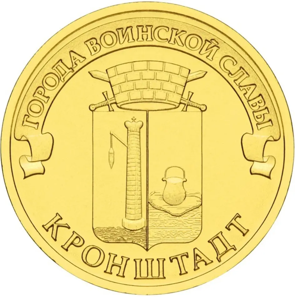 герб города Кронштадта, над ним, на ленте - надпись полукругом: "ГОРОДА ВОИНСКОЙ СЛАВЫ", внизу, вдоль канта - надпись: "КРОНШТАДТ".