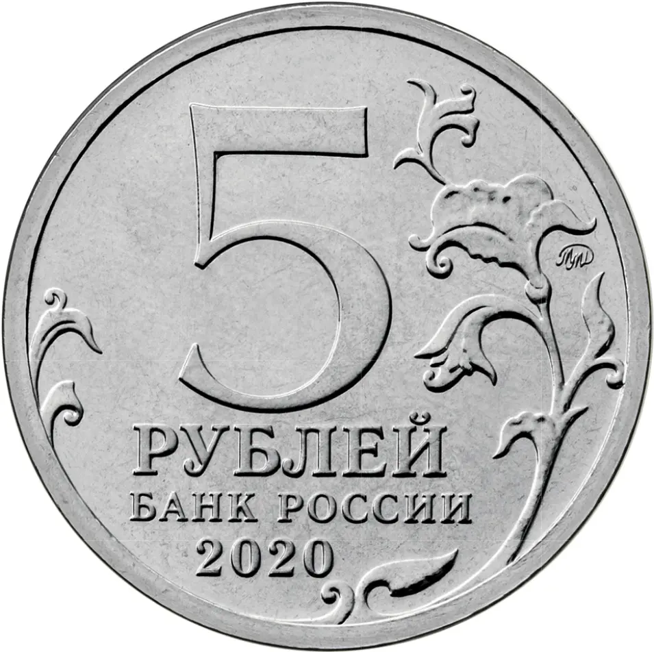 в центре диска — обозначение номинала монеты в две строки: «5 РУБЛЕЙ», ниже — надпись: «БАНК РОССИИ», под ней — дата: «2020», слева и справа — стилизованные ветви растения, в правой части монеты — товарный знак Московского монетного двора.