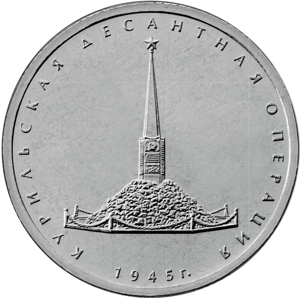 рельефное изображение «Памятника воинам Советской Армии — освободителям Курильских островов в 1945 г.»; вдоль канта — надписи: «КУРИЛЬСКАЯ ДЕСАНТНАЯ ОПЕРАЦИЯ» и «1945 г.».