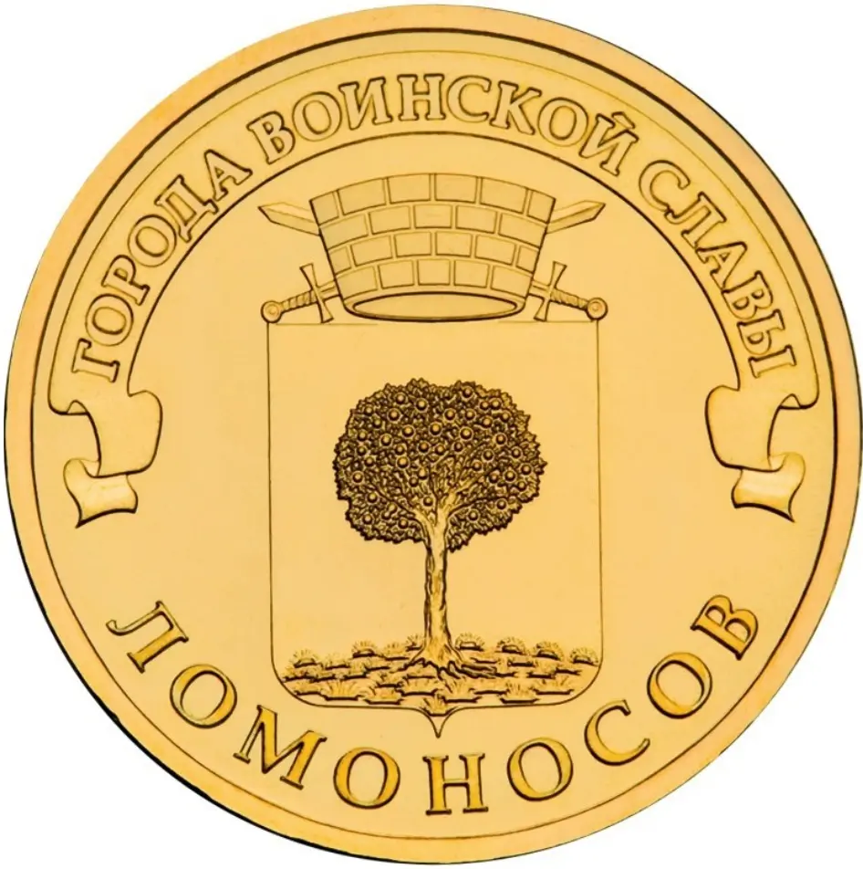 герб города Ломоносова, над ним, на ленте – надпись полукругом: "ГОРОДА ВОИНСКОЙ СЛАВЫ", внизу вдоль канта – надпись: "ЛОМОНОСОВ".
