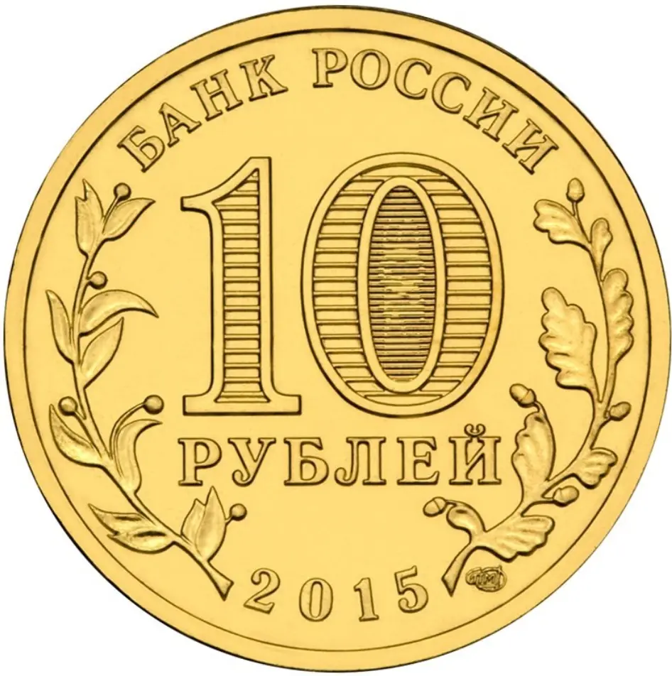 в центре диска – обозначение номинала монеты "10 РУБЛЕЙ". Внутри цифры "0" – скрытые, видимые поочередно при изменении угла зрения изображения числа "10" и надписи "РУБ". По окружности вдоль канта – надписи, вверху: "БАНК РОССИИ", внизу – дата: "2015", слева – стилизованное изображение лавровой ветви, справа – дубовой.