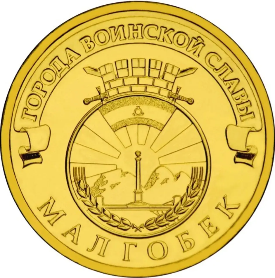 герб города Малгобека, над ним, на ленте - надпись полукругом: "ГОРОДА ВОИНСКОЙ СЛАВЫ", внизу, вдоль канта - надпись: "МАЛГОБЕК".
