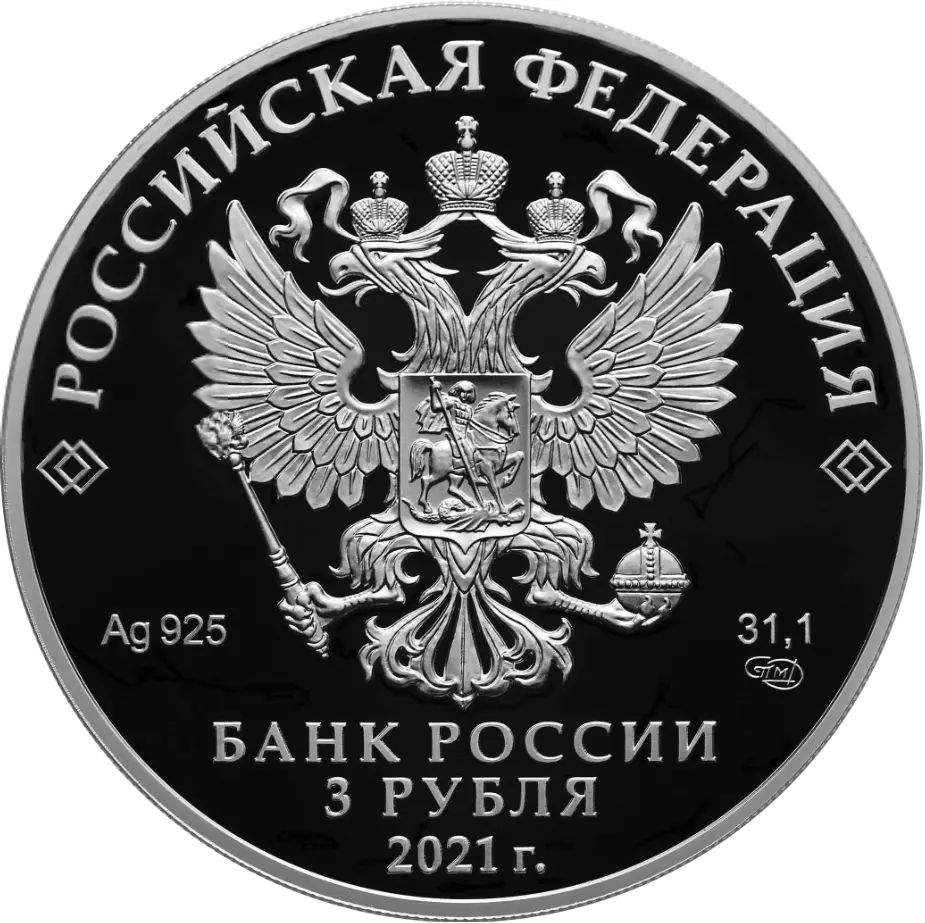 на зеркальном поле диска — рельефное изображение Государственного герба Российской Федерации, над ним вдоль канта — надпись полукругом: «РОССИЙСКАЯ ФЕДЕРАЦИЯ», обрамленная с обеих сторон сдвоенными ромбами, внизу под гербом: слева — обозначения драгоценного металла и пробы сплава, справа — содержание химически чистого металла и товарный знак монетного двора, внизу в центре в три строки — надпись: «БАНК РОССИИ», номинал монеты: «3 РУБЛЯ», год выпуска: «2021 г.».