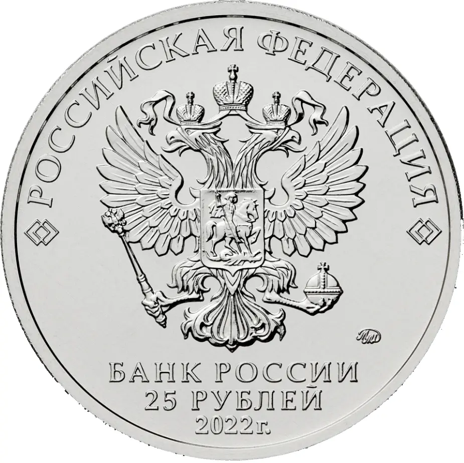 в центре — рельефное изображение Государственного герба Российской Федерации, над ним вдоль канта — надпись полукругом: «РОССИЙСКАЯ ФЕДЕРАЦИЯ», обрамленная с обеих сторон сдвоенными ромбами, под гербом в центре в три строки — надпись: «БАНК РОССИИ», номинал монеты: «25 РУБЛЕЙ», год выпуска: