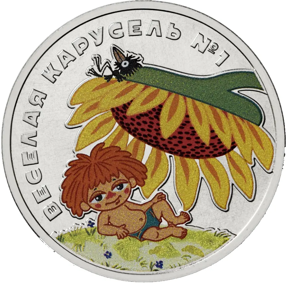 выполненное в цвете изображение сцены из мультипликационного журнала «Веселая карусель № 1»; слева вверху – рельефная надпись: «ВЕСЕЛАЯ КАРУСЕЛЬ № 1».