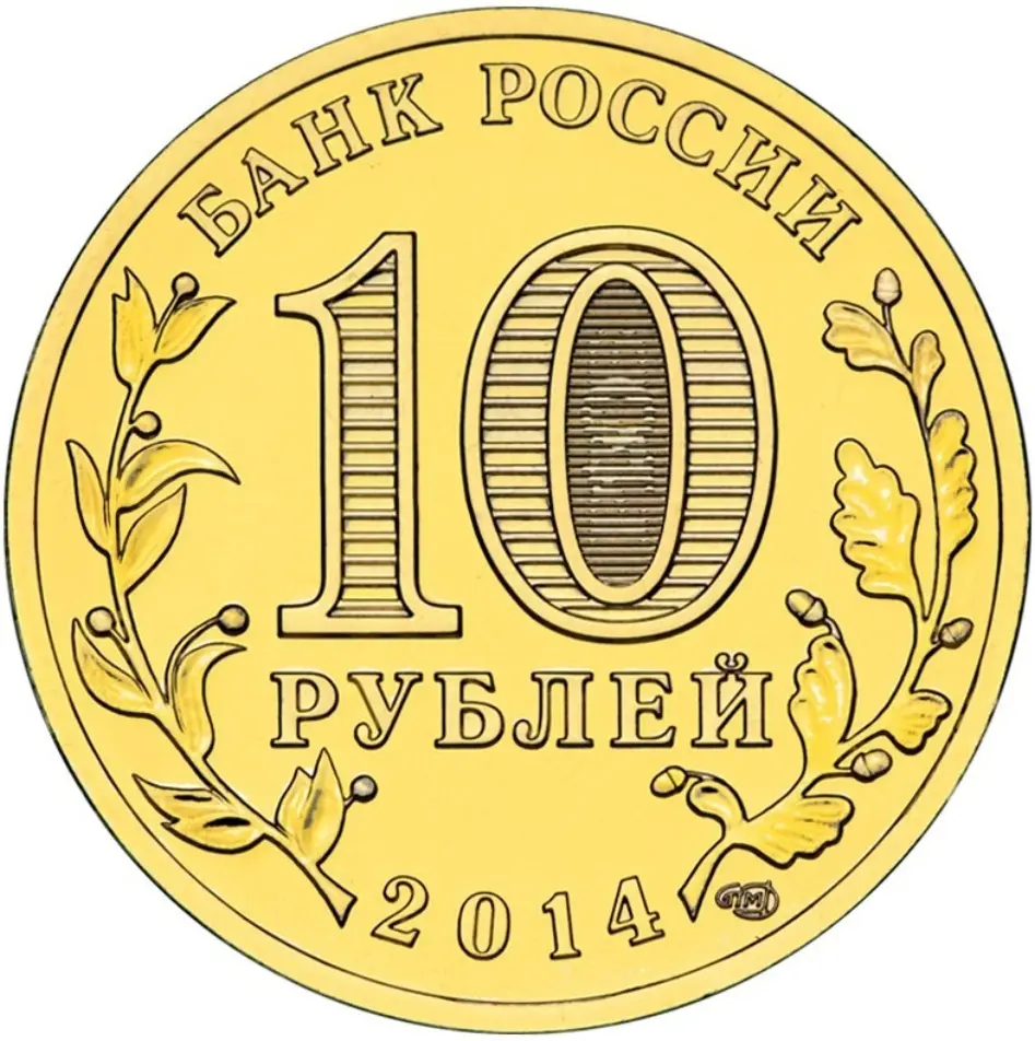 в центре диска – обозначение номинала монеты "10 РУБЛЕЙ". Внутри цифры "0" – скрытые, видимые поочередно при изменении угла зрения изображения цифры "10" и надписи "РУБ". По окружности вдоль канта – надписи, вверху: "БАНК РОССИИ", внизу – дата: "2014", слева – стилизованное изображение лавровой ветви, справа – дубовой.