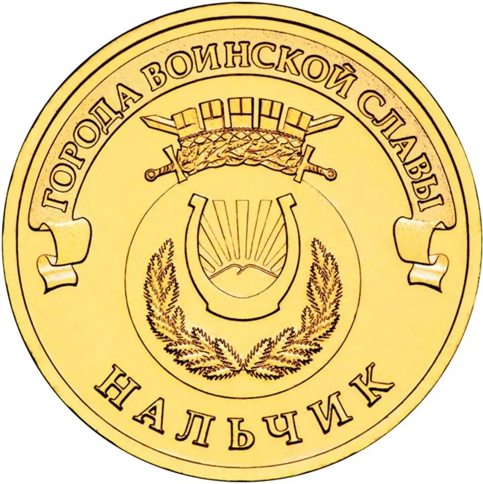 герб города Нальчика, над ним, на ленте – надпись полукругом: "ГОРОДА ВОИНСКОЙ СЛАВЫ", внизу, вдоль канта – надпись: "НАЛЬЧИК".