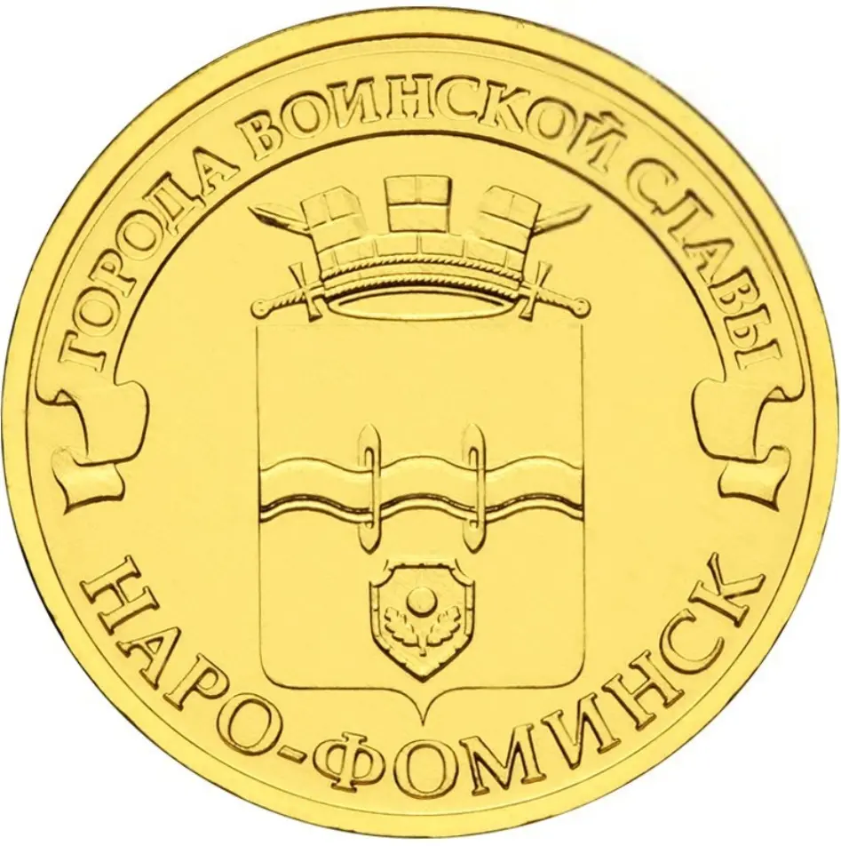 герб города Наро-Фоминска, над ним, на ленте - надпись полукругом: "ГОРОДА ВОИНСКОЙ СЛАВЫ", внизу, вдоль канта - надпись: "НАРО-ФОМИНСК".