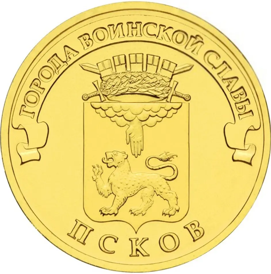 герб города Пскова, над ним, на ленте – надпись полукругом: "ГОРОДА ВОИНСКОЙ СЛАВЫ", внизу, вдоль канта – надпись: "ПСКОВ".