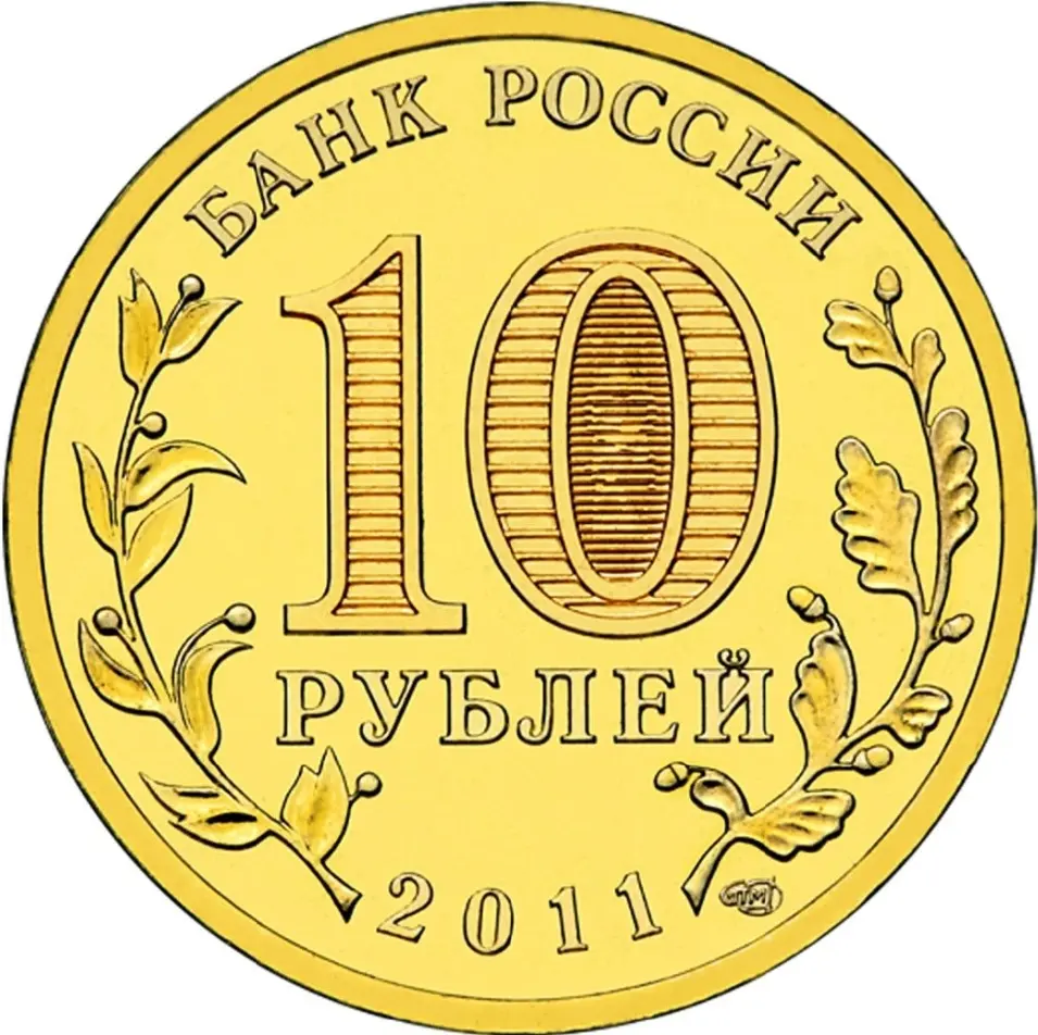 в центре диска - обозначение номинала монеты "10 РУБЛЕЙ". Внутри цифры "0" - скрытые, видимые поочередно при изменении угла зрения изображения цифры "10" и надписи "РУБ". По окружности вдоль канта - надписи, вверху: "БАНК РОССИИ", внизу - дата: "2011", слева - стилизованное изображение лавровой ветви, справа - дубовой.