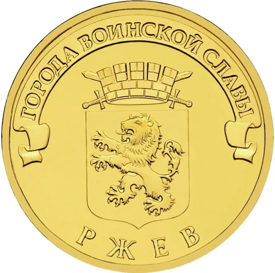 герб города Ржева , над ним, на ленте - надпись полукругом: "ГОРОДА ВОИНСКОЙ СЛАВЫ", внизу, вдоль канта - надпись: "РЖЕВ".