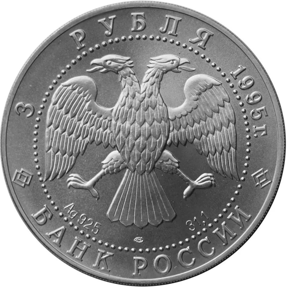 в центре диска - эмблема Банка России (двуглавый орёл художника И. Билибина), в нижней части - обозначение металла, проба сплава, товарный знак монетного двора и содержание драгоценного металла в чистоте. По окружности надписи, обрамлённые кругом из точек: вверху - "3 РУБЛЯ 1995 г.", внизу - "БАНК РОССИИ".