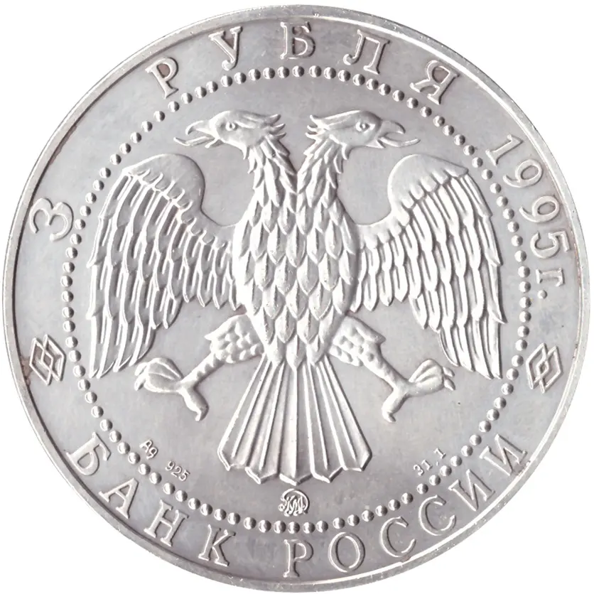 в центре диска - эмблема Банка России (двуглавый орёл художника И. Билибина), в нижней части - обозначение металла, проба сплава, товарный знак монетного двора и содержание драгоценного металла в чистоте. По окружности надписи, обрамлённые кругом из точек: вверху - "3 РУБЛЯ 1995 г.", внизу - "БАНК РОССИИ".