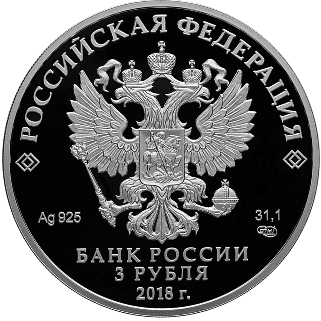 на зеркальном поле диска – рельефное изображение Государственного герба Российской Федерации, над ним вдоль канта – надпись полукругом: "РОССИЙСКАЯ ФЕДЕРАЦИЯ", обрамленная с обеих сторон сдвоенными ромбами, внизу под гербом: слева – обозначения драгоценного металла и пробы сплава, справа – содержание химически чистого металла и товарный знак монетного двора, внизу в центре в три строки – надпись: "БАНК РОССИИ", номинал монеты: "3 РУБЛЯ", год: "2018 г.".