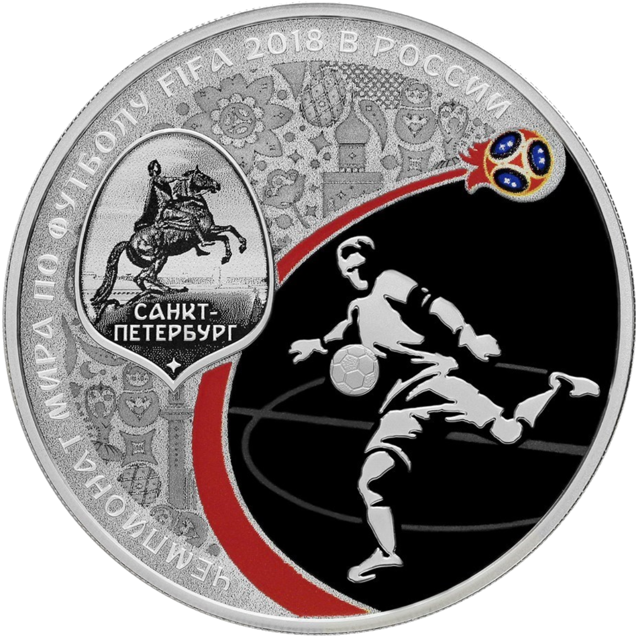 изображения картуша с памятником Петру I и надписью в две строки "САНКТ-ПЕТЕРБУРГ" на фоне орнамента, состоящего из элементов, отображающих российскую культуру и фольклорное наследие, а также футбольный мир; выполненной в цвете траектории полета стилизованного мяча, футболиста; по окружности – надпись: "ЧЕМПИОНАТ МИРА ПО ФУТБОЛУ FIFA 2018 В РОССИИ".