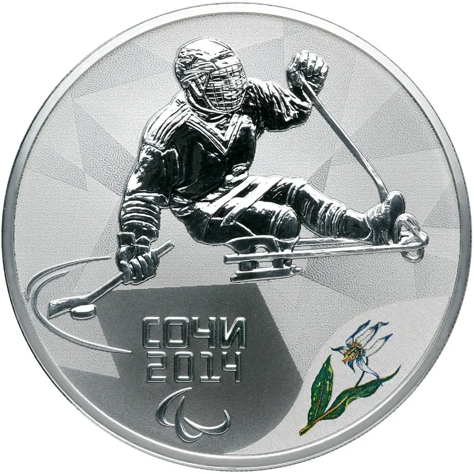 на матовом поле диска – рельефное изображение следж-хоккеиста, ведущего клюшкой шайбу, внизу в две строки – надпись: "СОЧИ" и дата: "2014", под ними – три паралимпийских агитоса, внизу справа у канта – цветное изображение соцветия кандыка кавказского.
