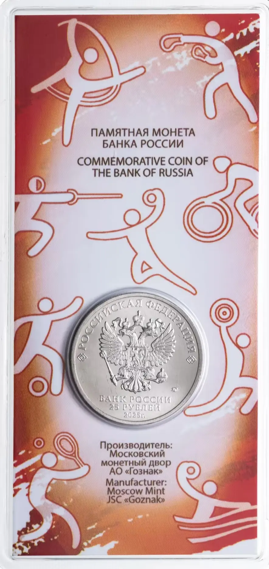 рельефное изображение Государственного герба Российской Федерации, над ним вдоль канта – надпись полукругом «РОССИЙСКАЯ ФЕДЕРАЦИЯ», обрамленная с обеих сторон сдвоенными ромбами, под гербом в центре в три строки – надпись «БАНК РОССИИ», номинал монеты «25 РУБЛЕЙ», год выпуска «2025 г.», справа – товарный знак монетного двора.