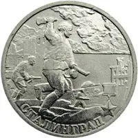 солдаты в момент атаки, справа - медаль "Золотая Звезда", разрушенный дом, на втором плане - очертания пылающего города на берегу реки, внизу по окружности - надпись: "СТАЛИНГРАД".