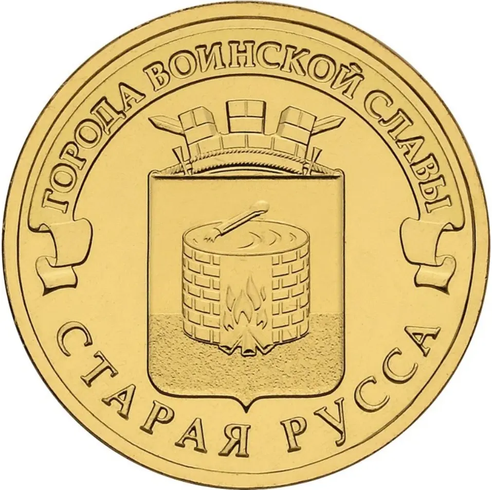 герб города Старая Русса, над ним, на ленте – надпись полукругом: "ГОРОДА ВОИНСКОЙ СЛАВЫ", внизу вдоль канта – надпись: "СТАРАЯ РУССА".