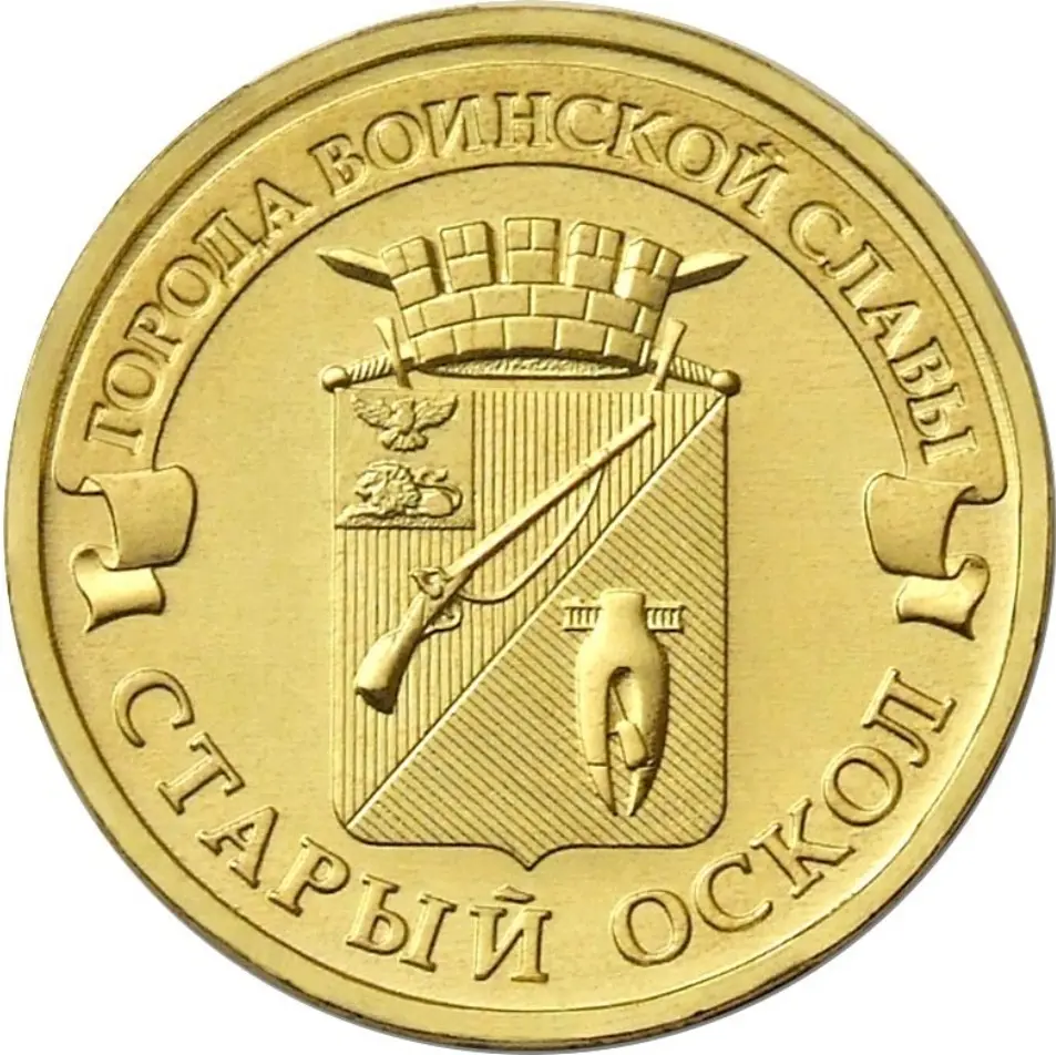 герб города Старый Оскол, над ним, на ленте – надпись полукругом: "ГОРОДА ВОИНСКОЙ СЛАВЫ", внизу вдоль канта – надпись: "СТАРЫЙ ОСКОЛ".