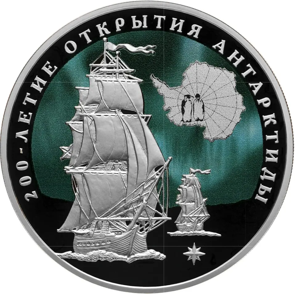 на зеркальном поле диска – рельефные изображения парусных шлюпов и – в нижней части монетного поля – путеводной звезды; в верхней части справа – изображение контура Антарктиды с фигурками двух пингвинов; цветное покрытие поля монеты имитирует полярное сияние; вдоль канта – надпись: "200-ЛЕТИЕ ОТКРЫТИЯ АНТАРКТИДЫ".