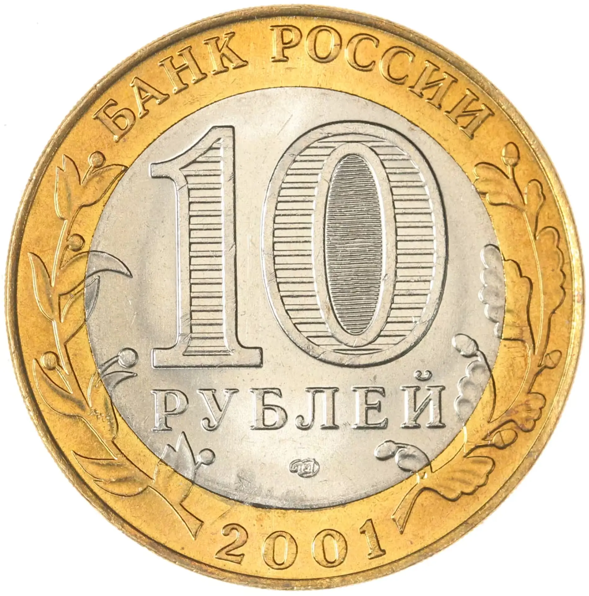 в центре диска — обозначение достоинства монеты "10 РУБЛЕЙ". Внутри цифры "0" — скрытые, видимые поочередно при изменении угла зрения изображения цифры "10" и слова "РУБЛЕЙ". В нижней части диска — товарный знак монетного двора. В верхней части кольца по окружности — надпись: "БАНК РОССИИ", в нижней — дата "2001", слева и справа — стилизованные ветви растений, переходящие на диск.