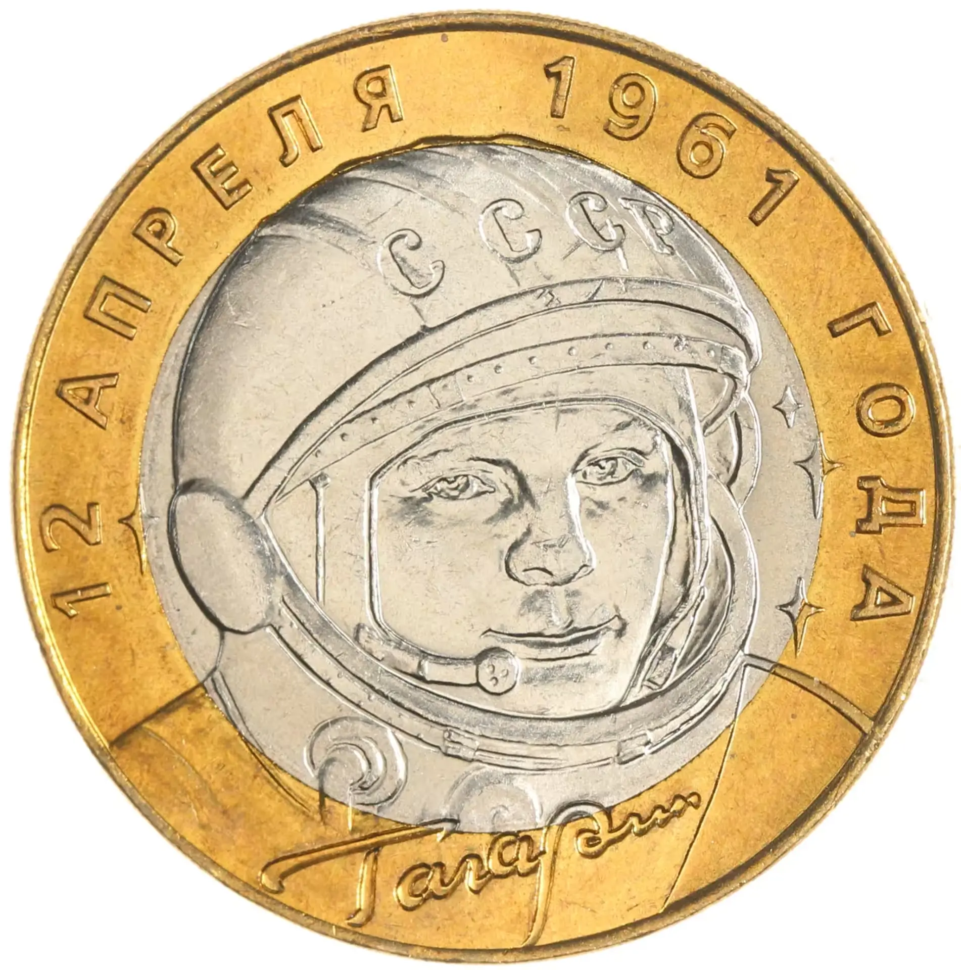 изображение Ю.А. Гагарина в скафандре, под ним — подпись-факсимиле "ГАГАРИН", вверху по окружности — надпись: "12 АПРЕЛЯ 1961 ГОДА".