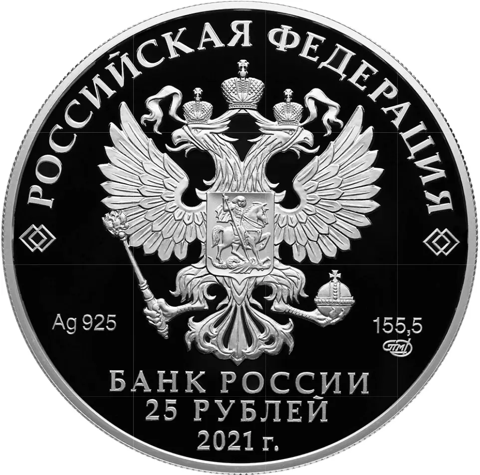 на зеркальном поле диска — рельефное изображение Государственного герба Российской Федерации, над ним вдоль канта — надпись полукругом: «РОССИЙСКАЯ ФЕДЕРАЦИЯ», обрамленная с обеих сторон сдвоенными ромбами, внизу под гербом: слева — обозначения драгоценного металла и пробы сплава, справа — содержание химически чистого металла и товарный знак монетного двора, внизу в центре в три строки — надпись: «БАНК РОССИИ», номинал монеты: «25 РУБЛЕЙ», год выпуска: «2021 г.».