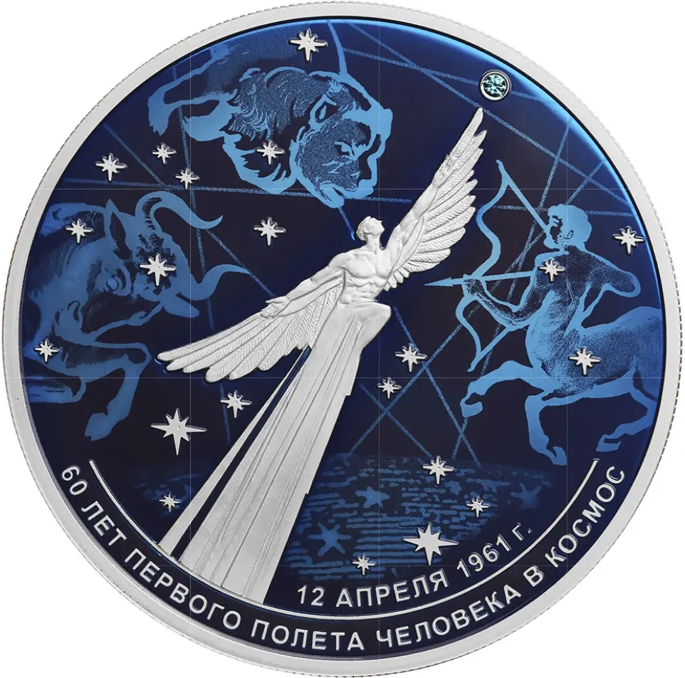 на зеркальном поле диска — рельефные изображения летящей фигуры человека с крыльями и звезды в виде вставки из искусственного камня на фоне выполненных в цвете стилизованных изображений звездного неба и мифологических животных — зодиакальных созвездий Тельца, Льва, Стрельца; внизу вдоль канта — надписи: «12 АПРЕЛЯ 1961 г.», «60 ЛЕТ ПЕРВОГО ПОЛЕТА ЧЕЛОВЕКА В КОСМОС».