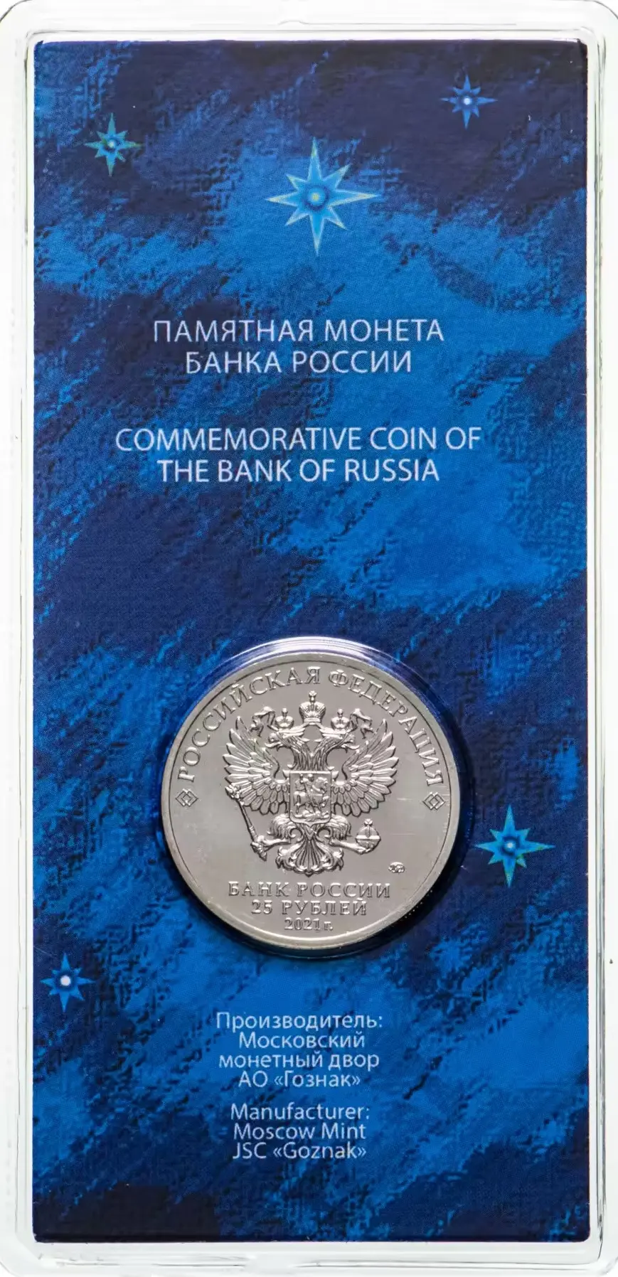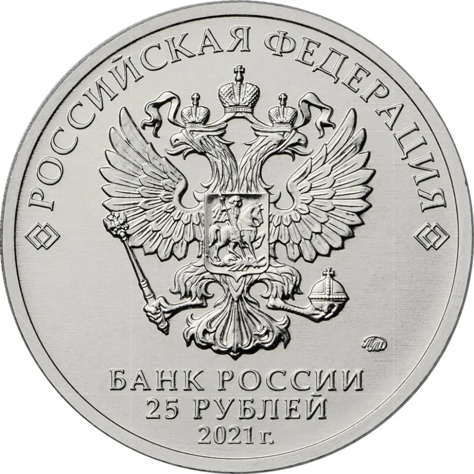 в центре — рельефное изображение Государственного герба Российской Федерации, над ним вдоль канта — надпись полукругом: «РОССИЙСКАЯ ФЕДЕРАЦИЯ», обрамленная с обеих сторон сдвоенными ромбами, под гербом в центре в три строки — надпись: «БАНК РОССИИ», номинал монеты: «25 РУБЛЕЙ», год выпуска: «2021 г.», справа — товарный знак монетного двора.