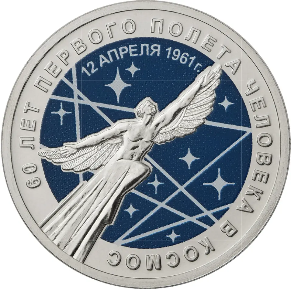 рельефное изображение летящей фигуры человека с крыльями на фоне выполненного в цвете стилизованного изображения звездного неба; имеются надписи, вверху по внутренней окружности: «12 АПРЕЛЯ 1961 г.», на кольце: «60 ЛЕТ ПЕРВОГО ПОЛЕТА ЧЕЛОВЕКА В КОСМОС».