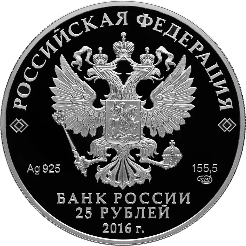 на зеркальном поле диска – рельефное изображение Государственного герба Российской Федерации, над ним вдоль канта – надпись полукругом: "РОССИЙСКАЯ ФЕДЕРАЦИЯ", обрамленная с обеих сторон сдвоенными ромбами, внизу под гербом: слева – обозначения драгоценного металла и пробы сплава, справа – содержание химически чистого металла и товарный знак монетного двора, внизу в центре в три строки – надпись: "БАНК РОССИИ", номинал монеты: "25 РУБЛЕЙ", год выпуска: "2016 г.".