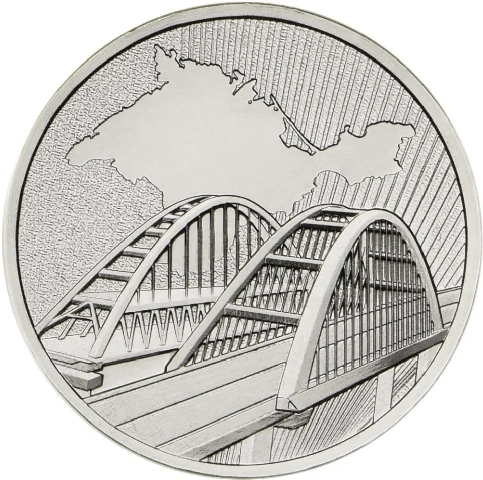 рельефное изображение моста, возведенного над Керченским проливом и соединяющего материковую часть России и полуостров Крым, на фоне стилизованной карты Крымского полуострова и расходящихся лучей.
