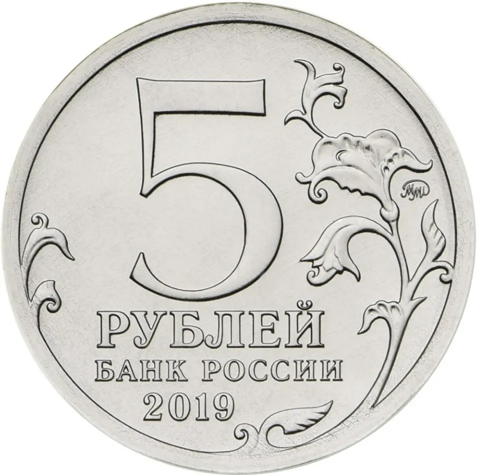 в центре диска – обозначение номинала монеты в две строки: "5 РУБЛЕЙ", ниже – надпись: "БАНК РОССИИ", под ней – год чеканки: "2019", слева и справа – стилизованные ветви растения, справа у канта – товарный знак монетного двора.