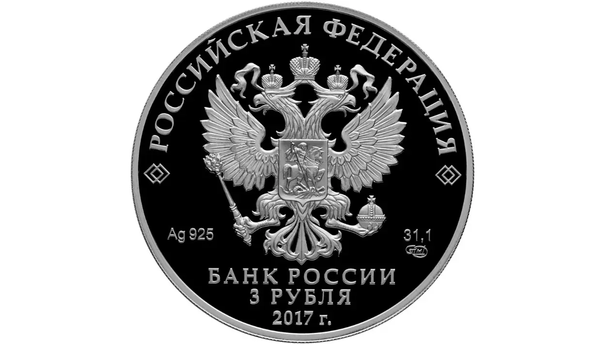 на зеркальном поле диска – рельефное изображение Государственного герба Российской Федерации, над ним вдоль канта – надпись полукругом: "РОССИЙСКАЯ ФЕДЕРАЦИЯ", обрамленная с обеих сторон сдвоенными ромбами, внизу под гербом: слева – обозначения драгоценного металла и пробы сплава, справа – содержание химически чистого металла и товарный знак монетного двора, внизу в центре в три строки – надпись: "БАНК РОССИИ", номинал монеты: "3 РУБЛЯ", год выпуска: "2017 г.".