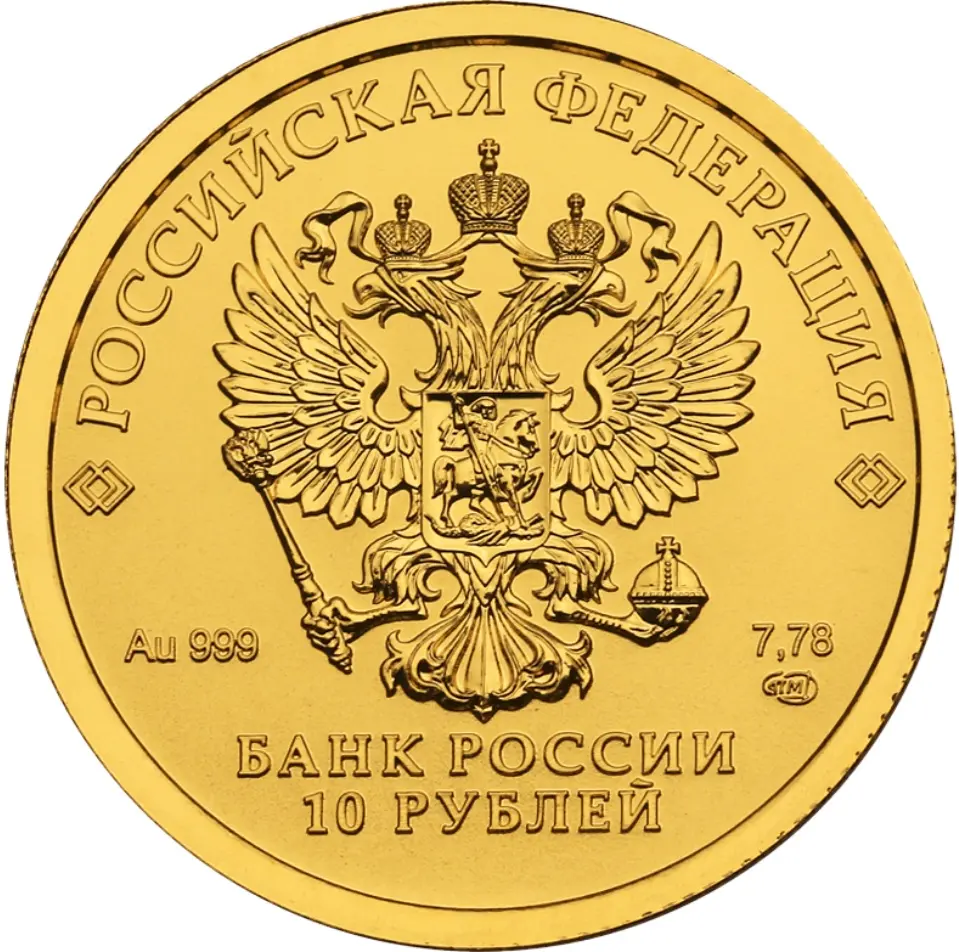 в центре – рельефное изображение Государственного герба Российской Федерации, над ним вдоль канта – надпись полукругом: «РОССИЙСКАЯ ФЕДЕРАЦИЯ», обрамленная с обеих сторон сдвоенными ромбами, внизу под гербом: слева – обозначения драгоценного металла и пробы, справа – содержание химически чистого металла и товарный знак монетного двора, внизу в центре в две строки – надпись: «БАНК РОССИИ», номинал монеты: «10 РУБЛЕЙ».