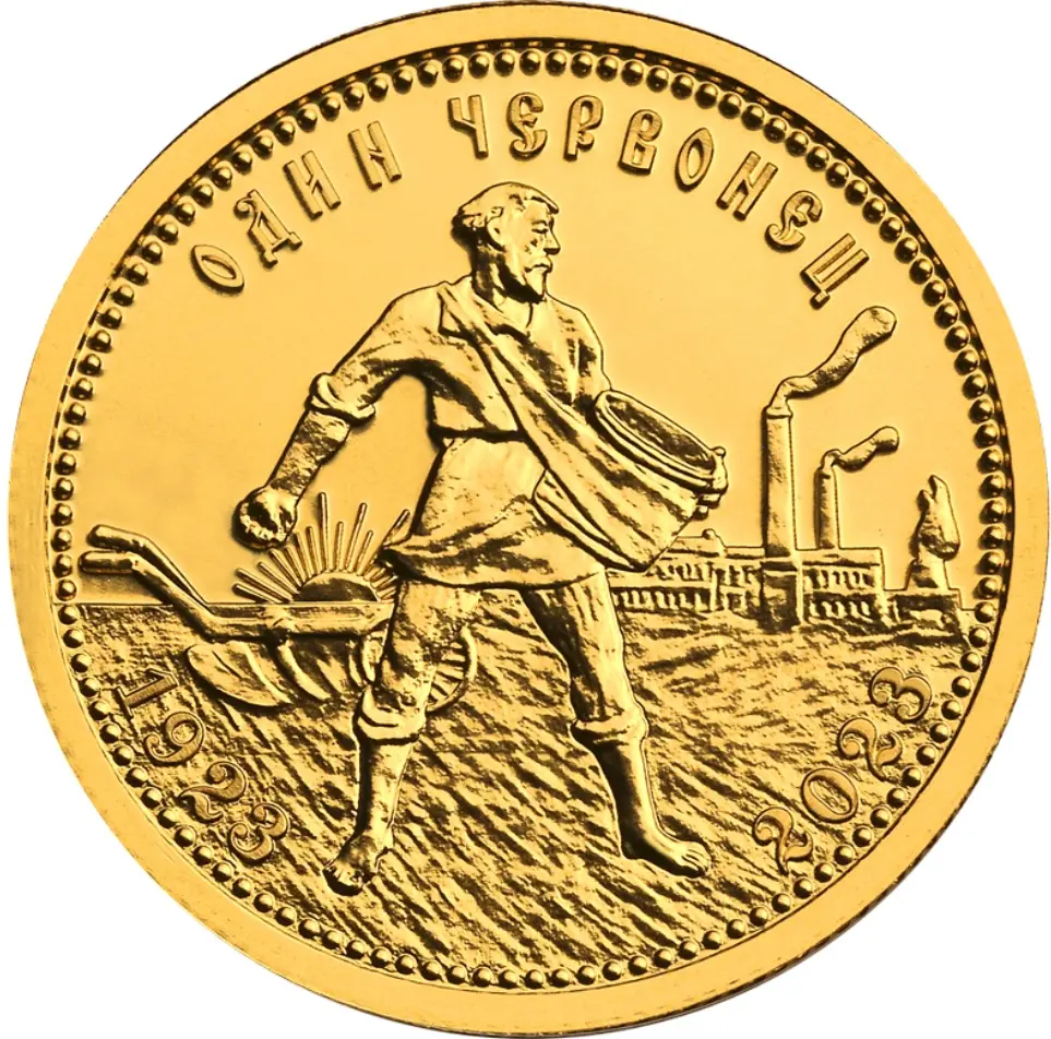 Однако для оборота выпускали не только бумажные деньги. С 1923 года на Петроградском монетном дворе начали выпускать золотые монеты-червонцы, которые по своим параметрам повторяли царские 10 рублей. Их дизайн был разработан медальером Антоном Васютинским на основе эскиза для одной из дореволюционных сельскохозяйственных выставок. На монете в полный рост изображен крестьянин-сеятель на фоне дымящихся труб, плуга и восходящего солнца. Золотых червонцев, датированных 1923 годом, было выпущено чуть более 2,7 млн штук.