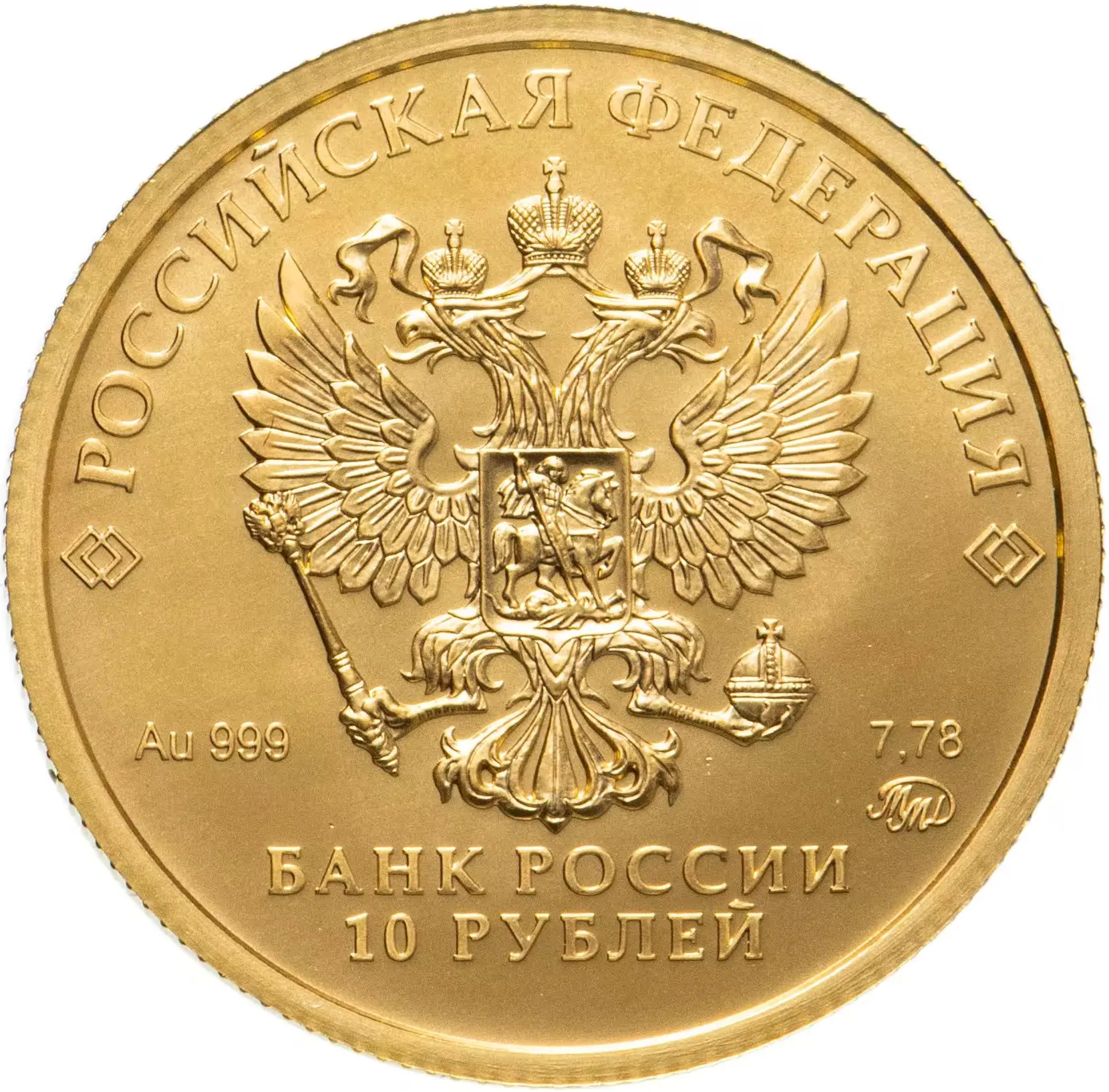 в центре – рельефное изображение Государственного герба Российской Федерации, над ним вдоль канта – надпись полукругом: «РОССИЙСКАЯ ФЕДЕРАЦИЯ», обрамленная с обеих сторон сдвоенными ромбами, внизу под гербом: слева – обозначения драгоценного металла и пробы, справа – содержание химически чистого металла и товарный знак монетного двора, внизу в центре в две строки – надпись: «БАНК РОССИИ», номинал монеты: «10 РУБЛЕЙ».