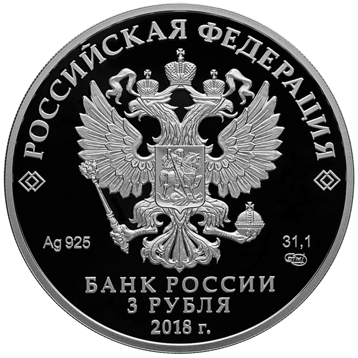 на зеркальном поле диска – рельефное изображение Государственного герба Российской Федерации, над ним вдоль канта – надпись полукругом: "РОССИЙСКАЯ ФЕДЕРАЦИЯ", обрамленная с обеих сторон сдвоенными ромбами, внизу под гербом: слева – обозначения драгоценного металла и пробы сплава, справа – содержание химически чистого металла и товарный знак монетного двора, внизу в центре в три строки – надпись: "БАНК РОССИИ", номинал монеты: "3 РУБЛЯ", год: "2018 г.".