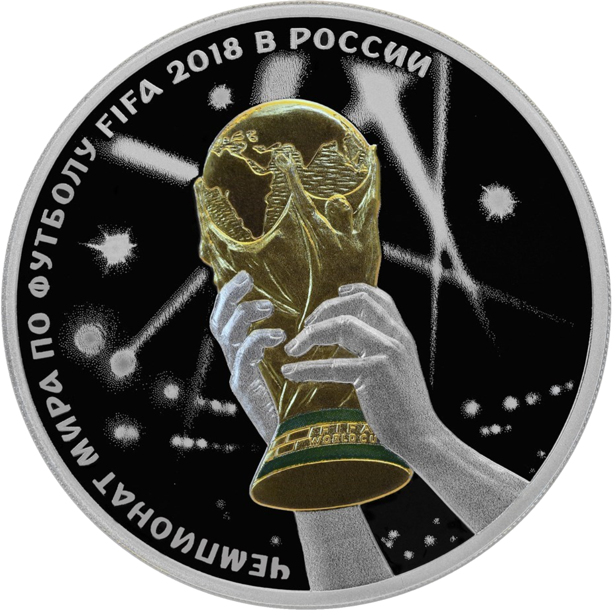 изображение Кубка Чемпионата мира по футболу FIFA на фоне стилизованной чаши стадиона, по окружности – надпись: "ЧЕМПИОНАТ МИРА ПО ФУТБОЛУ FIFA 2018 В РОССИИ".