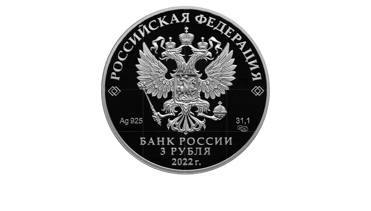 рельефное изображение Государственного герба Российской Федерации, над ним вдоль канта – надпись полукругом: «РОССИЙСКАЯ ФЕДЕРАЦИЯ», обрамленная с обеих сторон сдвоенными ромбами, под гербом: слева – обозначения драгоценного металла и пробы сплава, справа – содержание химически чистого металла и товарный знак монетного двора, внизу в центре в три строки – надпись: «БАНК РОССИИ», номинал монеты: «3 РУБЛЯ», год выпуска: «2022 г.».